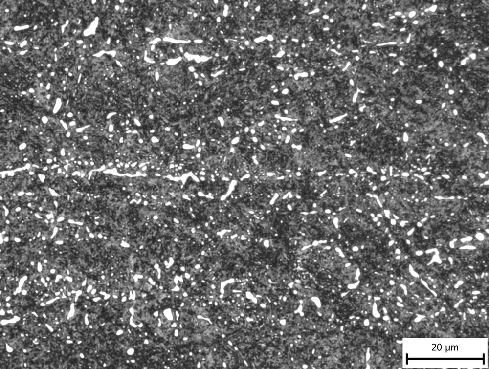 This steel has a fine carbide structure made up almost exclusively of a small volume of relatively soft iron carbides. As a result, this steel is very easy to sharpen on conventional ceramic or natural wet stones.